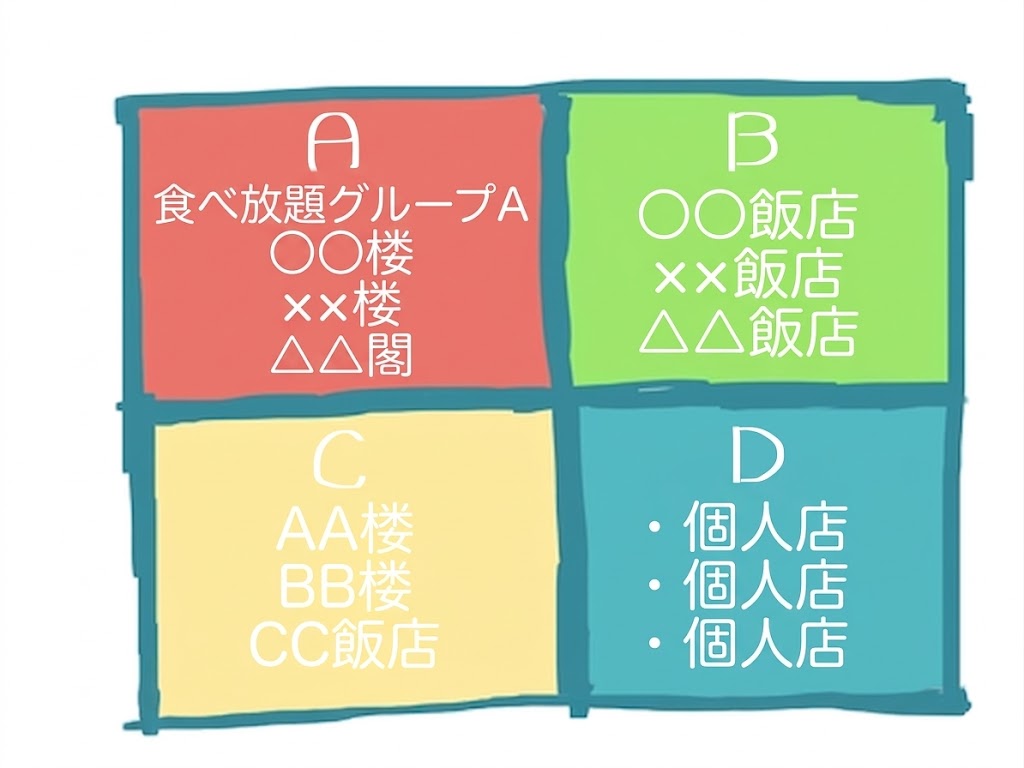 Aグループの店を1軒知ってれば他の店もほぼ同じだとわかります。