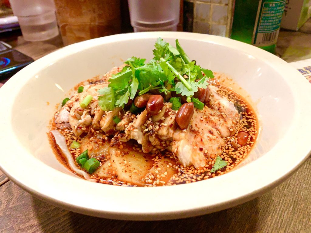 ゆで鶏をピリ辛ソースで和えた前菜。辛味と香ばしさが食欲をそそります。