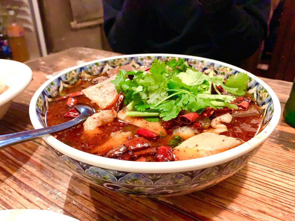 魚の切り身を唐辛子と花椒入りのスープで煮込んだ四川料理。辛さが効いたスープが特徴。