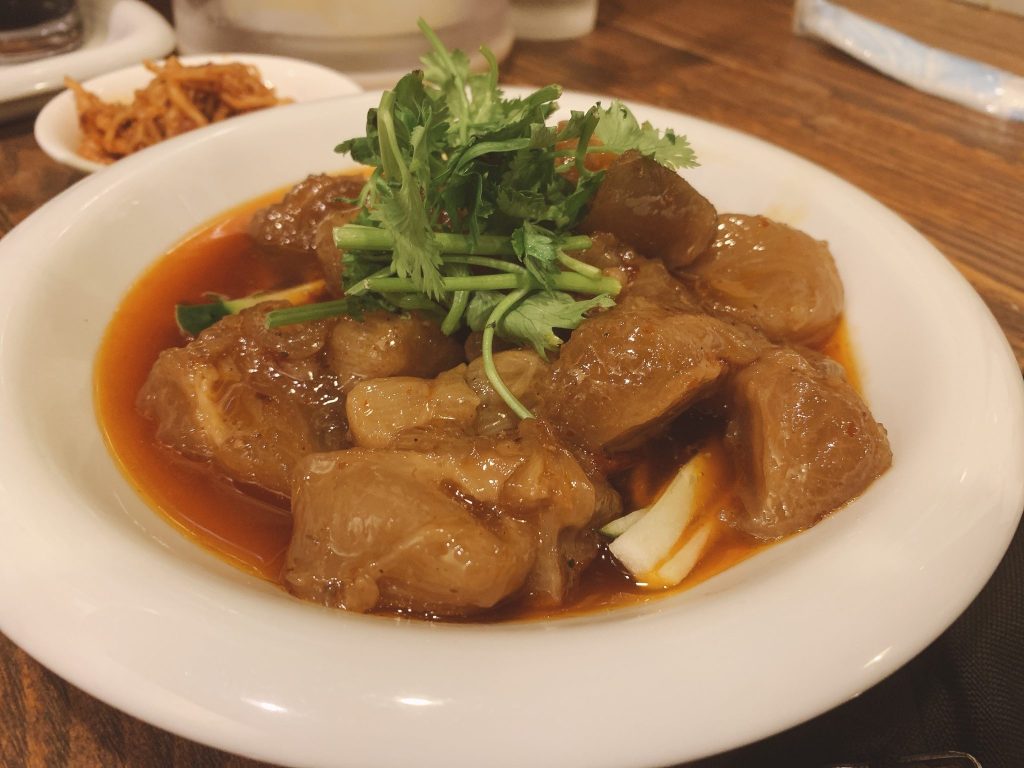牛筋を甘ソースで煮込んだ料理。柔らかく、味がしっかり染み込んでいます。とろっとろ!