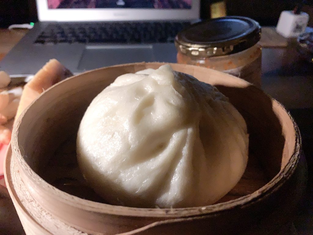 ふわふわの生地にジューシーな具が詰まった中華まんじゅうなのだ。ほんのり甘めのネギ風味が広東式。