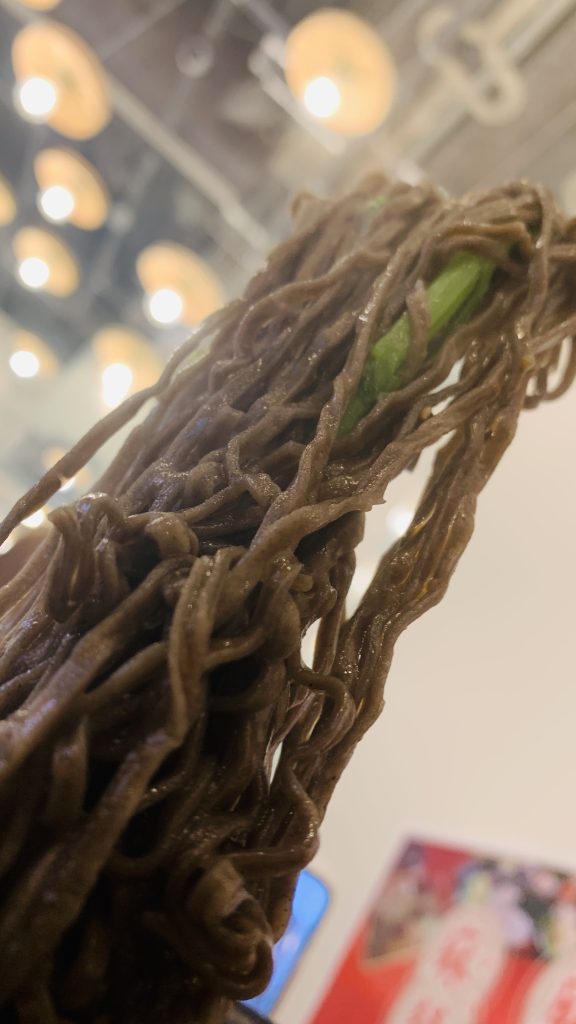 ピリ辛 麺黒いけどこれは蕎麦の袋麺。荞麦面てやつがお蕎麦さん。日本蕎麦よりもほろ苦なんかな??中国のそばだからダッタン蕎麦ってやつや。白身魚トッピングがバチいけてる。