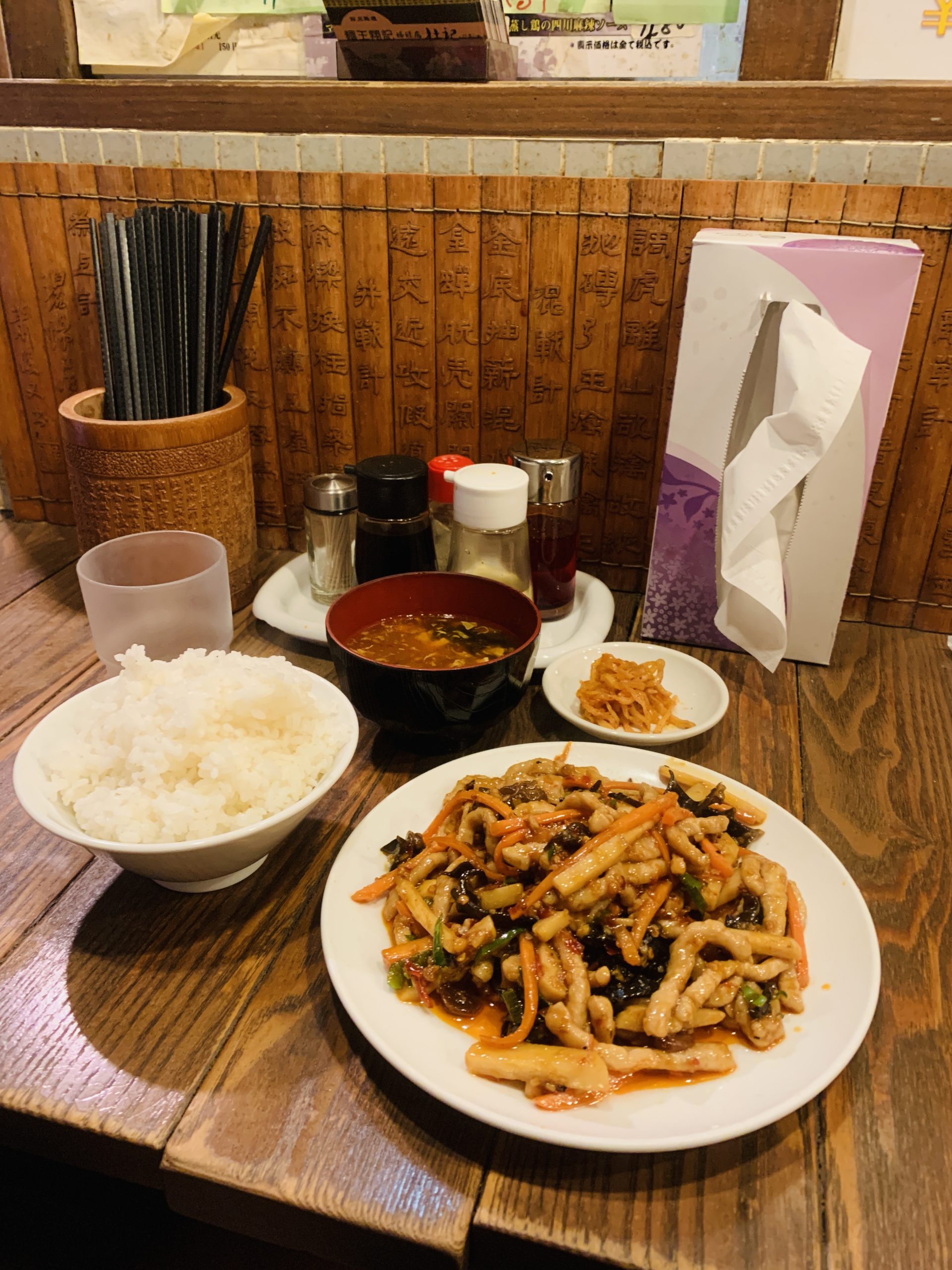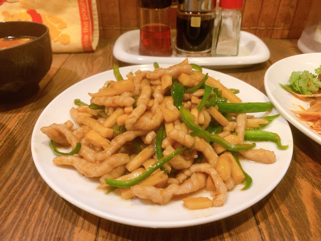 画像は定食じゃないですがー、お肉さんのタンパク質、ピーマンさんや玉ねぎさんの食物繊維やビタミン、タケノコさんの食物繊維やカリウム(むくみ解消)などなど、バランスが非常によいです。油多くね?というツっこみもありそうですが、タケノコさんは油を相殺できる食材であるため、また、女装おぢさんは中国茶をがぶ飲み生活であるため、油が脂になる前に体外に出ちゃうわけです。というか中国の習慣ですね。