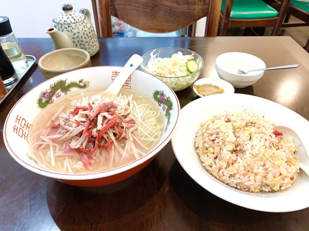 柔らかいチャーシューがのったあっさり塩スープの麺と、パラッと香ばしい半炒飯がセットになったお得な一品です。